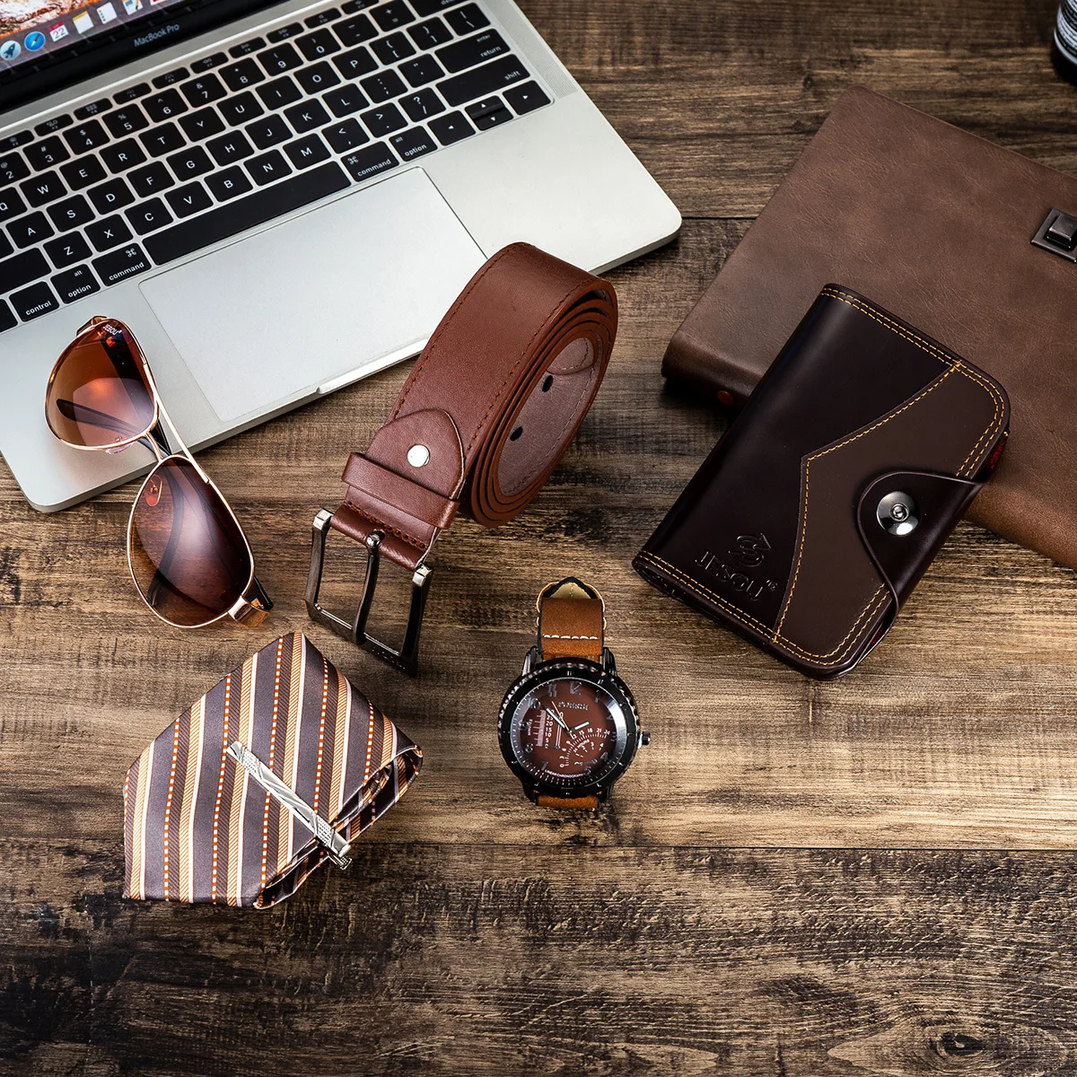 Aproveite esse Conjunto com Óculos, Relógio, Cinto, Carteira, Gravata, Caneta e Chaveiro, que combinam perfeitamente. Você pode escolher entre o modelo com 5 peças ou 6 peças. |