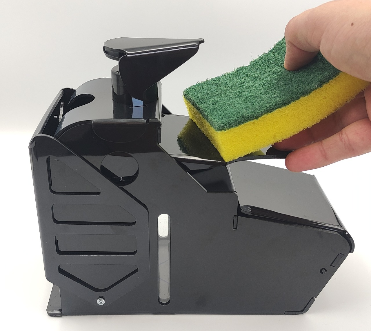 Agiliza a limpeza dos utensílios de cozinha proporcionando economia e segurança pois evita o manuseio do frasco de detergente, bastando um leve toque com as costas da mesma mão que segura a esponja na alavanca de ação.